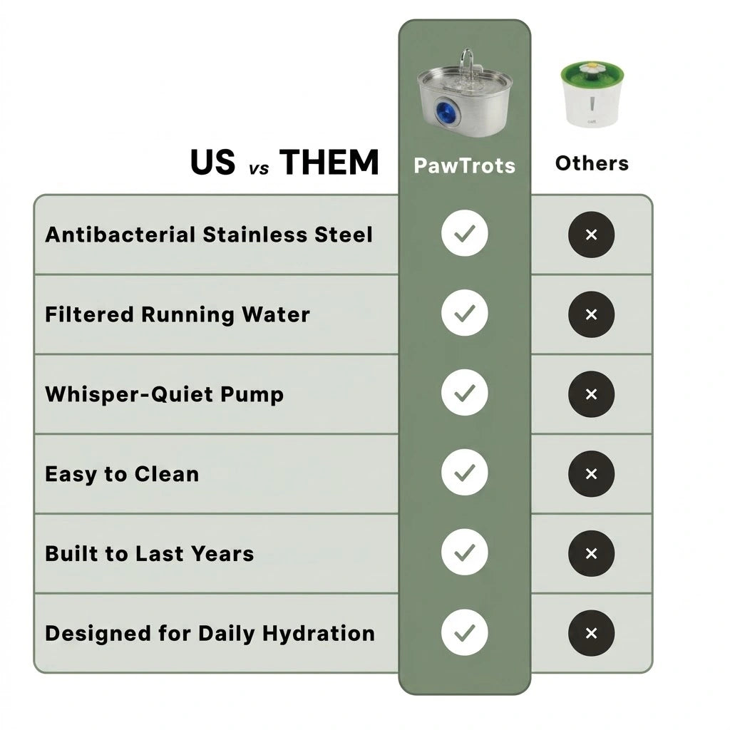 Three things. First, the entire bowl is surgical stainless steel — not plastic coated in steel — so bacteria has nowhere to hide. Second, Pawtrots uses true triple-stage filtration plus UV sterilization, where most Amazon fountains rely on a single carbon filter. Third, every unit is backed by a 2-year warranty and real U.S. customer support. Most cheap fountains are designed to be replaced in three months. Pawtrots is built to last.